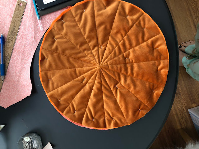 While fabric hunting I found this perfect peach velvet fabric and because this is the color of everything good & right in my house right now, I bought some. I knew exactly what I was going to make! I thrifted a cushion form several months ago, so all I did was measure across the pillow, right direct center from one side to the other. Now I took that number and added 1/2" to it so my total was 14 1/2 inches. That would give me a 1/4" seam allowance all around. I literally just freehanded it as I drew an X as my center point then just marked out 7 1/4 inches from that X til I had the complete circle marked.
